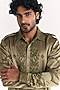 Featuring a green pathani kurta in linen satin base with dori embroidery. It is paired with salwar pants. Style it up with mojaris for a festive occasion, mehendi or engagement ceremony.