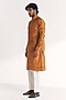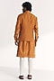 Featuring a mustard nehru jacket in linen satin base with floral embroidery. It is paired with a kurta and chanderi pants. Style it up with mojaris and malas for a haldi, wedding, sangeet or engagement ceremony.