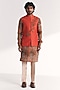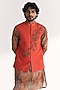 Featuring a tangerine nehru jacket in linen satin base with floral embroidery. It is paired with a tissue organza printed kurta and chanderi pants. Style it up with mojaris and malas for a festive occasion, wedding, sangeet or engagement ceremony.