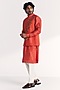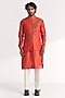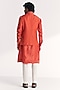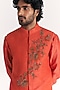 Featuring a tangerine nehru jacket in linen satin base with floral embroidery. It is paired with a kurta and chanderi pants. Style it up with mojaris and malas for a festive occasion, wedding, sangeet or engagement ceremony.