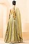 Featuring a mustard and green lehenga in fine silk base with digital print and hand embroidery. It is paired with halter neck blouse and a scalloped dupatta. Perfect for an engagement or sangeet ceremony.