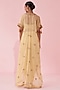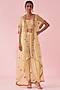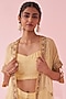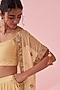 Featuring a yellow cape in crepe, organza and katan base with resham, zari, dori and badla hand embroidery. It is paired with a bustier and tulip pants. Accentuate it with kundan polki earrings and heels for festive occasions or haldi ceremony.