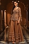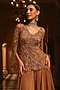 Featuring a gold strappy blouse in satin base. It is paired with a net hand embroidered jacket having split sleeves and organza sharara pants. Style this lehenga with jewelry, block heels, and an embellished potli bag for an elegant festive occasions, wedding or engagement ceremony.
