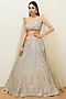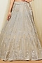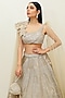 Featuring a nude and gold lehenga in organza base with pearls, sequins, crystals, and cutwork embroidery. It is paired with a matching one-shoulder blouse having cape sleeves and feather detailing.