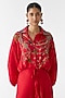 Featuring a red crop top in vegan silk base with placement digital print, embroidered collar and a drawstring. It is paired with a skirt. Style it with statement earrings and block heels, perfect for an evening wear.