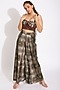 Featuring a brown bustier in cotton silk base with contrasting cups and piping. It is paired with contrasting olive green printed pants.