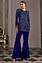 Featuring an electric blue top in georgette base with rounded hem and sculpted sleeves. It is paired with pants. Accentuate it with zircon jewellery and block heels for festive celebrations or cocktail soirees.