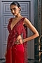 Featuring a red draped saree in satin base with embroidery. It is paired with an embroidered blouse. Accentuate it with statement earrings and heels for a festive occasion, cocktail party or sangeet ceremony.