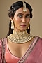 Featuring a gold finish choker necklace studded with kundan polki, set in mixed metal. It is paired with a pair of earrings and a maangtikka. Ideal for adding a regal touch to wedding celebrations, festive soirees or grand receptions.
