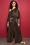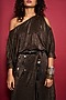 Featuring a copper off-shoulder jumpsuit in metallic crush base with a cut-out and overlapped bottom, including an attached belt.