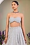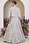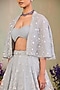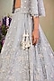 Featuring an ice blue kalidar lehenga in pure silk organza base with floral motifs, applique, sequins, beads and silver zari work, including swarovski crystal hangings It is paired with a blouse and a jacket. Accentuate it with jewellery and heels for wedding ceremonies.