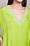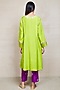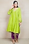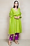 Featuring a parrot green kurta in silk base with floral butti and applique embroidery. It is paired with contrasting violet pants and an organza dupatta.