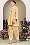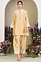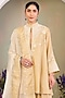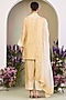 Featuring a pastel yellow A-line short kurta in handwoven silk chanderi base with applique, silk thread floral motifs and swarovski crystal work, including mandarin collar and bell sleeves. It is paired with pakistani salwar pants and a light yellow handwoven chanderi mulmul dupatta. Accentuate it with statement earrings and heels for a festive occasion or wedding ceremony.