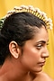 Featuring a gold finish mathapatti studded with pearls, set in copper.
