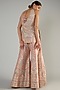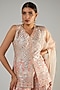 Featuring a champagne front open kurta in slub silk base with resham, gota and leather machine embroidery, including floral details. It is paired with matching sharara pants and an organza dupatta.