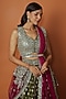 Featuring a green lehenga in slub silk base with mirror and zari embroidery. It is paired with a blouse, a pink organza dupatta and a belt. Accentuate it with statement earrings and heels for a wedding or engagement ceremony.