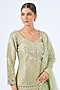 Featuring a green kurta in tissue base with mirror work, zari and gota embroidery. It is paired with embroidered sharara pants and a net dupatta. Accentuate it with dangle earrings and heels for a festive occasion or sangeet ceremony.