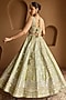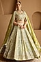 Featuring a green kalidar lehenga in tissue base with zari and mirror embroidery. It is paired with an embroidered blouse and an organza dupatta. Accentuate the designer lehenga with kundan polki or gold jewellery, embellished heels and a potli bag for a complete look, Perfect wear for your wedding, sangeet or engagement ceremony.