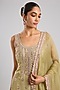 Featuring a green kurta in tissue base with resham and mirror embroidery. It is paired with embroidered gharara pants and an organza dupatta. Accentuate it with kundan polki or meenakari jewellery and block heels for a sangeet, wedding or engagement ceremony.