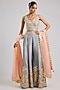 Featuring a grey blouse in tissue base with patch and mirror embroidery. It is paired with embroidered sharara pants and a peach organza dupatta. Accentuate it with kundan polki or meenakari jewellery and block heels for a sangeet, wedding or engagement ceremony.