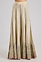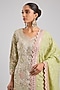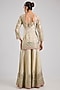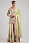 Featuring an ivory kurta in tissue base with patch and mirror embroidery. It is paired with embroidered sharara pants and a green organza dupatta. Accentuate it with kundan polki or meenakari jewellery and block heels for a haldi, wedding or engagement ceremony.