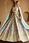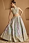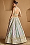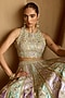Featuring a lime green and aqua blue lehenga in taffeta base with gota and mirror embroidery. It is paired with an embroidered halter-neck blouse and an organza dupatta. Accentuate the designer lehenga with kundan polki or gold jewellery, embellished heels and a potli bag for a complete look, Perfect wear for your wedding, sangeet or engagement ceremony.