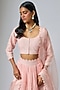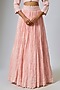 Featuring a peach pink pleated lehenga in organza base with dori work. It is paired with a blouse and a dupatta. Accessorise it with a kundan choker and a matching embellished clutch for a stylish ensemble, ideal for daytime weddings or festive celebrations.
