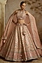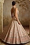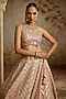 Featuring a peach lehenga in tissue base with resham, gota and mirror embroidery. It is paired with an embroidered halter-neck blouse and an organza dupatta. Accentuate the designer lehenga with kundan polki or gold jewellery, embellished heels and a potli bag for a complete look, Perfect wear for your wedding, sangeet or engagement ceremony.