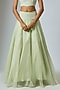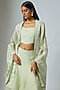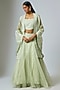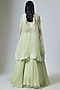 Featuring a pista green cape in organza base with dori work. It is paired with a blouse and a skirt. Accessorise it with a statement kundan necklace set and heels for a stylish ensemble, ideal for sangeet nights or mehendi celebrations.