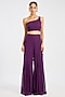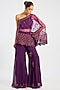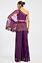 Featuring a purple one-shoulder cape in organza base with dori, cutdana, sequins and pearl embroidery. It is paired with a georgette top and pants. Accentuate it with dangler earrings and heels for cocktail parties.