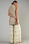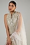 Featuring a champagne front open kurta in slub silk base with zari and mirror embroidery, including floral details. It is paired with contrasting white georgette gharara pants and a net dupatta.