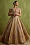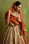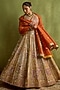 Featuring a yellow lehenga in slub silk base with zari and gota embroidery. It is paired with an embroidered blouse and a rust organza dupatta. Accentuate it with kundan polki or meenakari jewellery, embellished heels and a potli bag for a complete look, perfect wear for a wedding, sangeet or engagement ceremony.