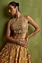 Featuring a yellow lehenga in slub silk base with zari, gota and mirror embroidery. It is paired with a halter-neck blouse and an organza dupatta. Accentuate it with kundan polki or meenakari jewellery, embellished heels and a potli bag for a complete look, perfect wear for a wedding, sangeet or engagement ceremony.