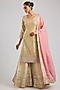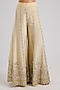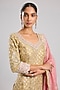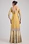 Featuring a yellow kurta in tissue base with patch and mirror embroidery. It is paired with embroidered sharara pants and an organza dupatta. Accentuate it with kundan polki or meenakari jewellery and block heels for a haldi, wedding or engagement ceremony.