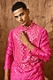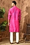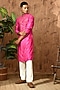 Featuring a pink kurta in raw silk base with mirror work. It is paired with pyjama pants. Style it up with kolhapuri sandals for a festive occasion, wedding or engagement ceremony.