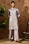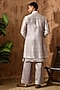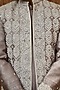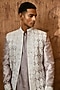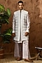 Featuring a lavender indowestern in linen satin base with zardosi embroidery. It is paired with a kurta and pyjama pants. Style it up with mojaris for a wedding or engagement ceremony.