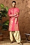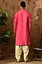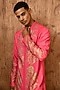 Featuring a pink kurta in cotton tussar base with pittawork and block print. It is paired with salwar pants. Style it up with kolhapuri sandals for a festive occasion, wedding or engagement ceremony.