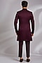 Featuring a wine indo-western in linen base with hand embroidery. It is paired with satin pants. Style it with mojaris for a festive occasion, cultural event, wedding or engagement ceremony.