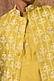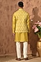Featuring a yellow nehru jacket in linen satin base with embroidery. It is paired with a kurta and pants. Perfect wear for a festive occasion or mehendi ceremony, exuding traditional charm and elegance.