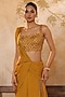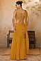 Featuring a golden yellow saree in flat silk chiffon base. It is paired with a pure raw silk blouse having sequins, resham and bead embroidery. Accentuate it with statement earrings and elegant heels for a stylish ensemble, ideal for festive gatherings or haldi ceremonies.
