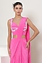 Featuring a pink pre-draped saree in crepe base. It is paired with a blouse having sequins, resham, moti and bead hand embroidery. Accentuate it with statement earrings and elegant heels for a stylish ensemble, ideal for festive gatherings, cocktail evenings or refined celebrations.