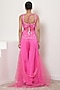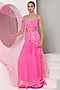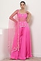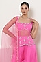 Featuring a pink blouse in silk crepe base with nakshi, dabka, moti, sequins and resham embroidery. It is paired with satin organza draped sharara and a tulle dupatta. Accentuate it with kundan polki jewellery, a potli bag and block heels for a graceful look. Perfect for a wedding, sangeet or engagement ceremony.