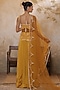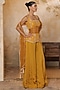 Featuring a yellow blouse in silk crepe base with nakshi, dabka, moti, sequins and resham embroidery. It is paired with satin organza draped sharara and a tulle dupatta. Accentuate it with kundan polki jewellery, a potli bag and block heels for a graceful look. Perfect for a wedding, haldi or engagement ceremony.