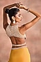 Featuring a misted yellow skirt in silk taffeta base with slit detail. It is paired with an embellished blouse. Accentuate it with statement jewellery and heels for a cocktail or sangeet ceremony.