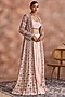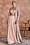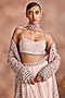 Featuring a peach jacket in chanderi silk base with an embellished belt. It is paired with an embellished blouse and skirt. Accentuate it with statement earrings and heels for a festive occasion, sangeet ceremony or cocktail.