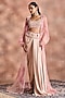 Featuring a pearl blush cape in georgette crepe and pure organza base with print and embellishments. It is paired with a blouse and a draped skirt. Accentuate it with statement earrings and heels for a festive look, sangeet or engagement ceremony.