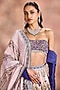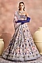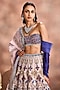 Featuring a royal blue lehenga in chanderi silk base with print and embellishment. It is paired with an embellished bustier, opera gloves and a dupatta. Accentuate it with dangler earrings and heels for sangeet, engagement or wedding ceremony.