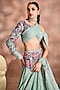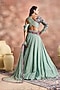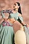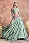 Featuring a smoke green skirt in crinkled shimmer silk tissue base with embroidery. It is paired with a blouse and a dupatta. Accentuate it with heels and statement earrings for festive occasion, sangeet or cocktail ceremonies.
