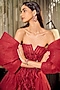 Featuring a wine strapless ball gown in tulle base with embellishments and tiered skirt, including detachable sleeves. Accentuate the designer gown with swarovski or zircon earrings, strappy heels and an embellished clutch for ball parties, gala dinners or cocktail ceremonies.