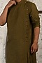 Featuring an olive green asymmetric kurta in linen jute base with side pleats. It is paired with contrasting grey pants.